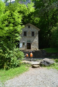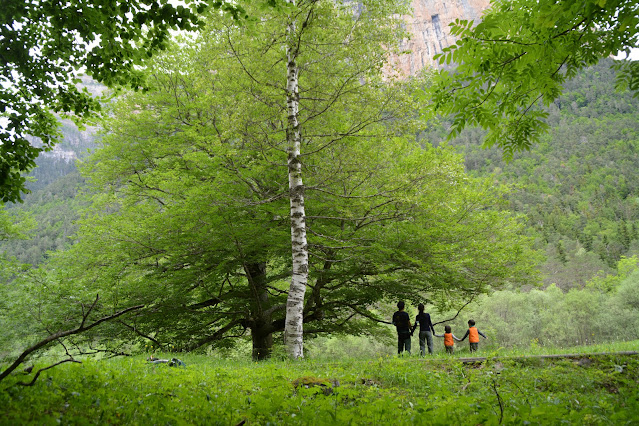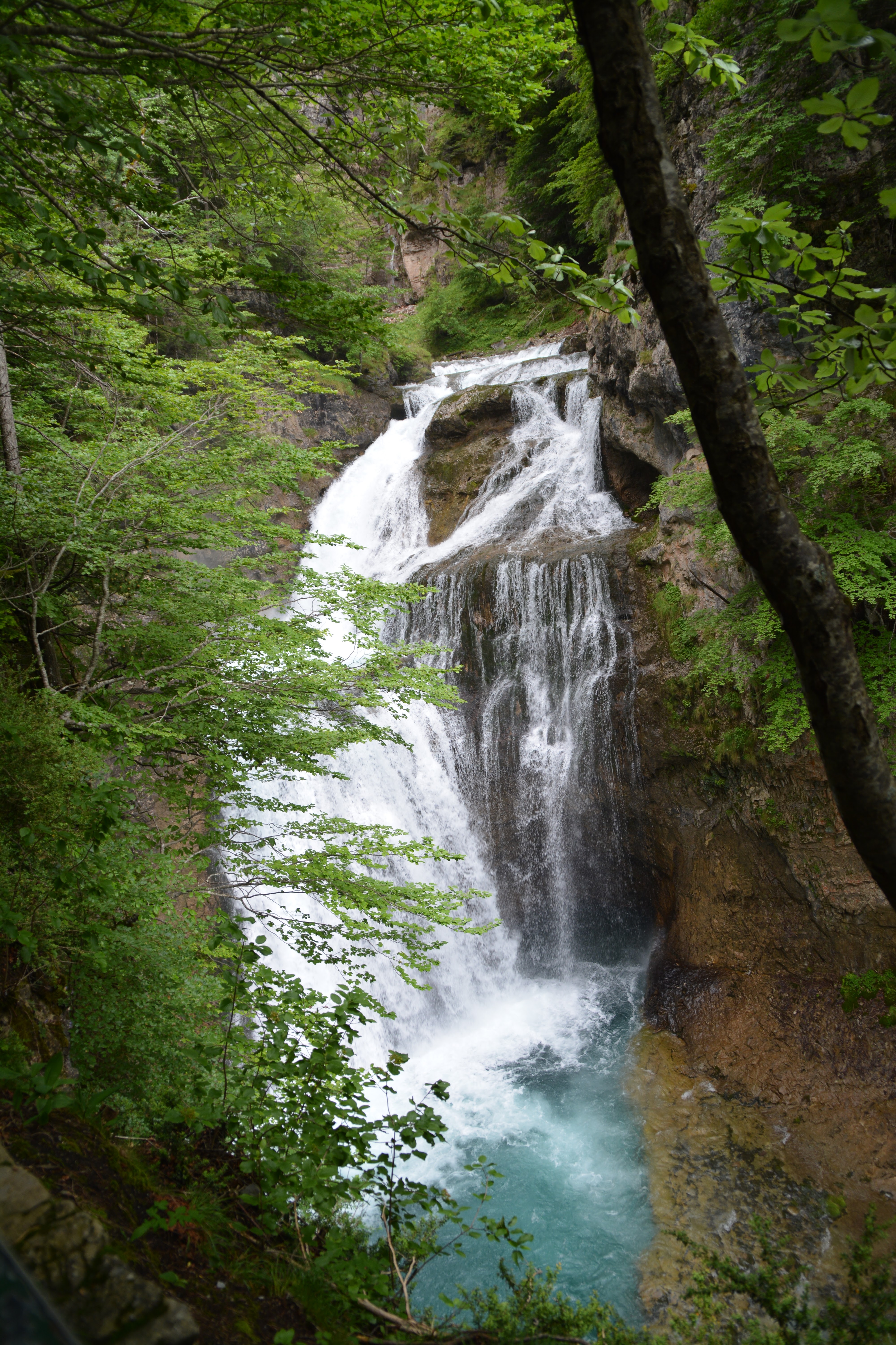 Al día siguiente, retomamos el camino dirección el PN de Ordesa y Monte Perdido. Llegamos a buena hora para adentrarnos entre sus hayedos y decidimos realizar la ruta que nos llevaría hasta las cascadas de Arripas, de La Cueva y de Los Estrechos desde el parking de la Pradera. La cascada de Los Estrechos nos dejó sin palabras, impresionante caída de agua con un sonido muy particular. Los niños quedaron sorprendidos y nosotros encantados. La senda no presenta mayor dificultad que alguna pendiente algo pronunciada. Conseguimos salvar el cansancio del gamusino nº1 usando el GPS del móvil (lo que nos dio una idea fantástica), y con el gamusino nº2 tan solo era cantar y buscar insectos. La ida la realizamos siguiendo las indicaciones del GR-11 dirección a las Gradas de Soaso hasta llegar a la bifurcación que nos llevaría a las cascadas. La vuelta la realizamos por el margen paralelo al de la ida cruzando un puente al que se llega siguiendo las indicaciones de «Senda» que encontraremos al salir de la cascada de La Cueva y siempre siguiendo el curso del río Arazas.