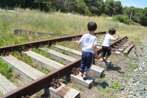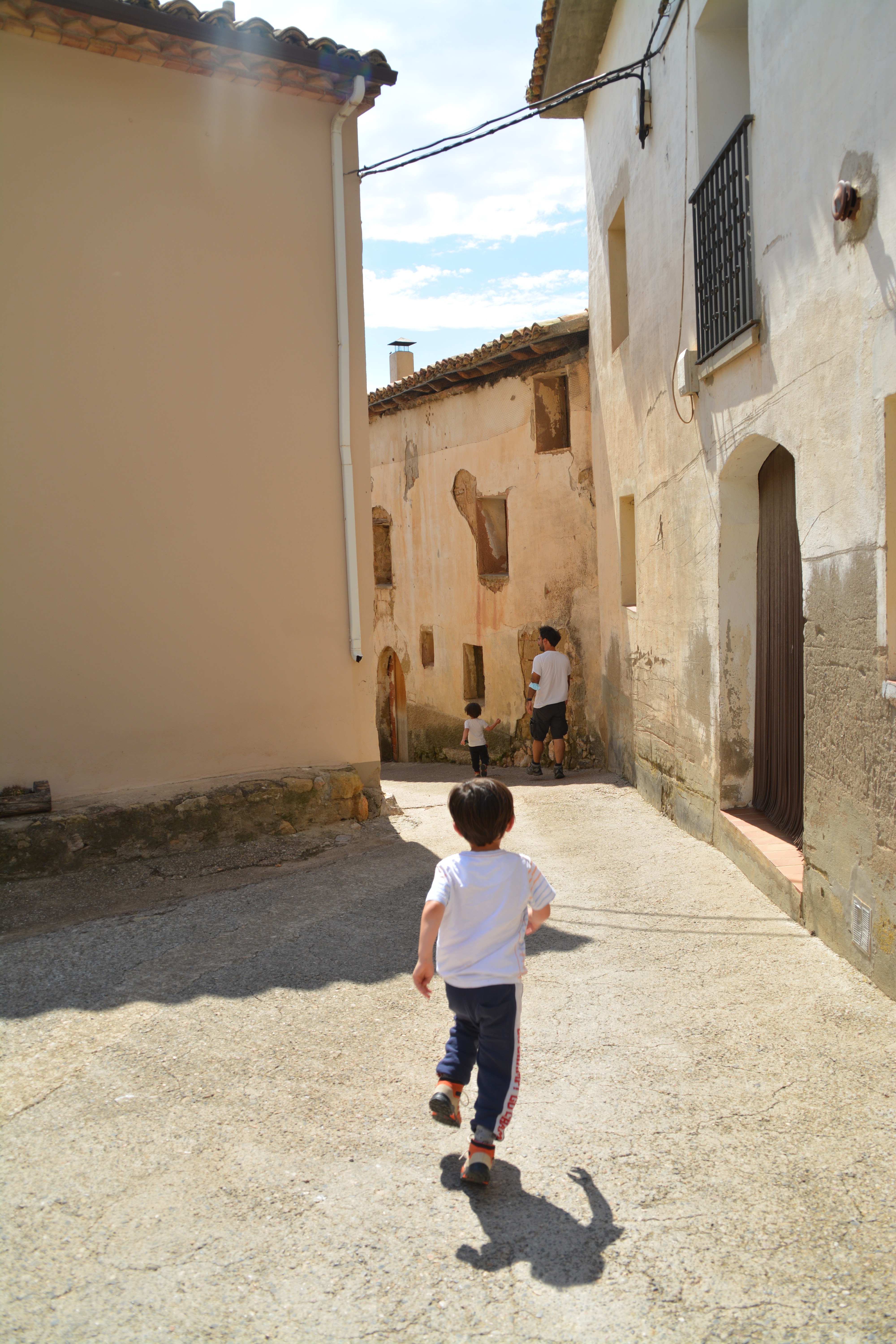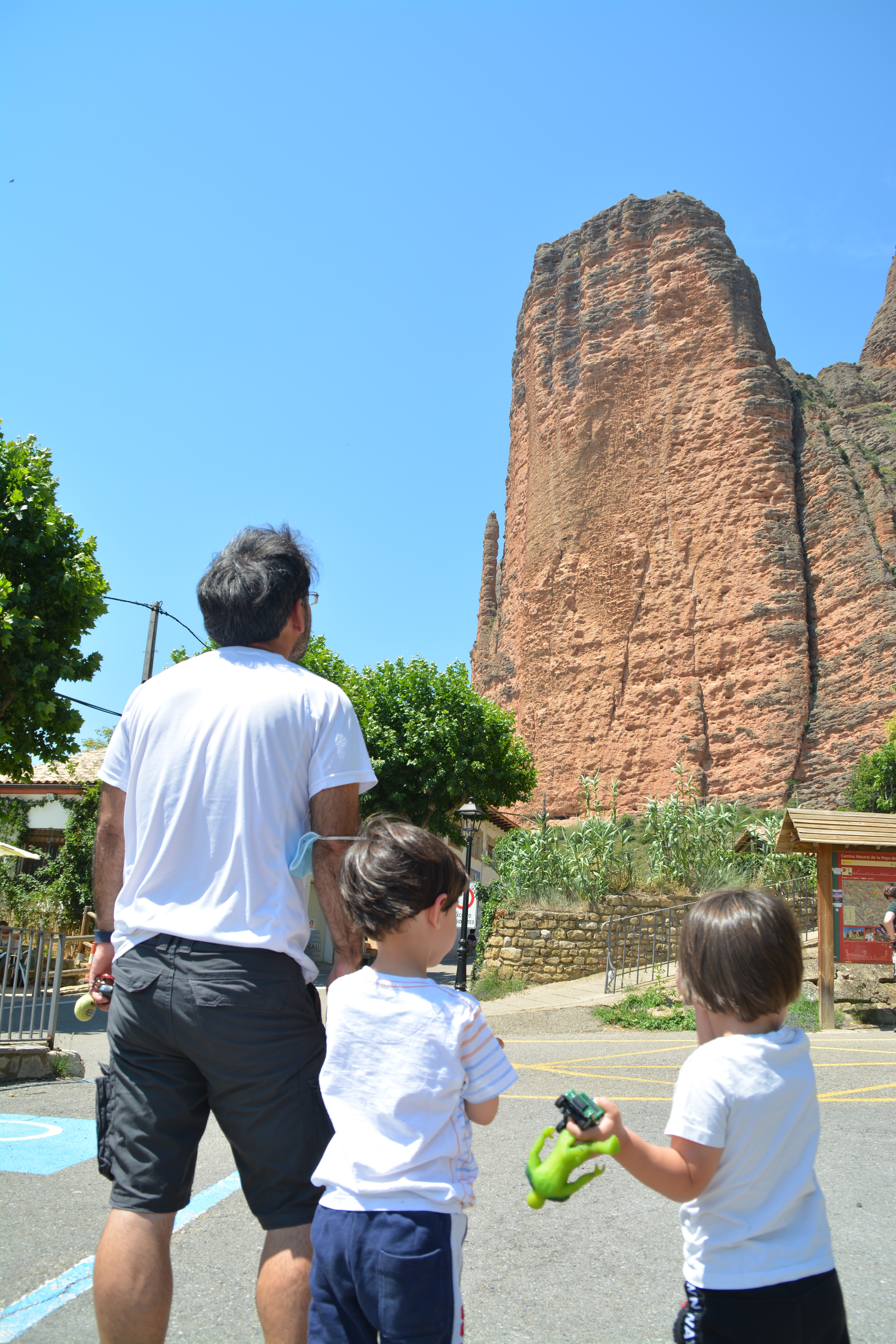 Los niños estuvieron haciendo equilibrios de traviesa en traviesa sobre el carril sin circulación y curioseando con las mariposas. Esta zona va cambiando su decoración cada vez que pasamos. Hace un tiempo había algunas traviesas apiladas y ahora tan solo queda este curioso aparato de dilatación.Y llega el momento de atravesar las puertas de entrada al Pirineo. Riglos es conocido por sus Mallos y por ser un paraíso de escaladores donde existen cientos de vías equipadas y seguras. Es bonito pasear por sus calles e ir acercándote poco a poco a las paredes que te reciben con cordialidad. El lugar es impresionante. Te encuentras con rinconcitos en los que vale la pena parar a curiosear. Hay un caminito que lleva hasta la ermita de San Martín y desde ahí se puede acceder a una senda que conduce hacia el comienzo de zonas de escalada.