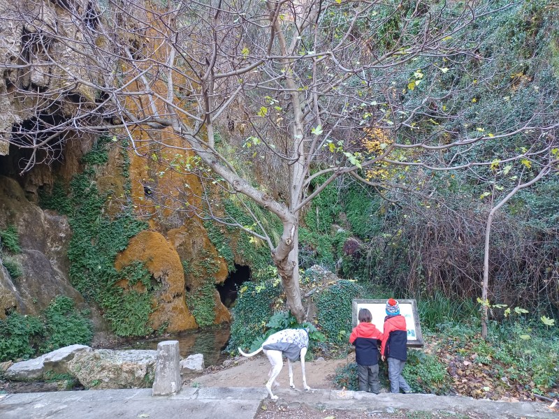 Nos encontramos con rincón mágico, el Paraje de los Chorros de Barchel o Humedal de Barchel donde se han formado unas oquedades tobáceas (de roca caliza) con abundante musgo. Aquí hicimos una parada e investigamos un poquito lo que la naturaleza nos regala. Según hemos leído posteriormente, en ocasiones cae una maravillosa cascada cuyas aguas concluyen en el río Turia. No pudimos verla en su máximo esplendor pero sí que nos dedicó una suave melodía con su sutil caída de agua.