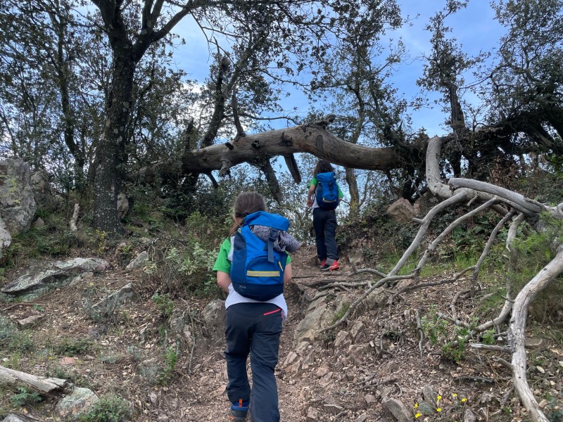 Nuestra primera parada para reponer energías es el Collado de Los Castañeros y observamos la cantidad de raíces de los árboles que sobresalen pero que se ven enlazados debajo de la tierra. Es una verdadera maravilla poder disfrutar de estos lugares tan peculiares. Los árboles que destacan en este tramo son los pinos de rodeno y los alcornoques. Un poquito más arriba de este Collado, volvemos a parar pues de repente se observa la cruz que define el Pico Espadán.