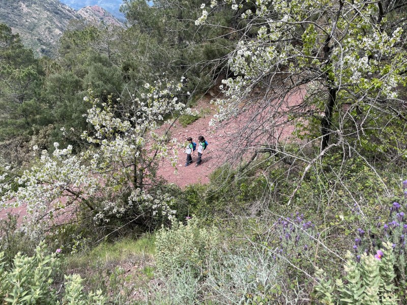 La vuelta se realiza por el mismo sitio hasta encontrar un desvío que nos lleva por una pista forestal y recibe el nombre de PR-CV 63.6. Este camino conecta con el Camino de Ibola que va bordeando el Barranco de Agua Negra. Más adelante se llega al Collado de Mujeres donde nos llamó la atención encontrar pequeñas cuevas y donde además pudimos ver cerezos en flor.